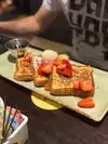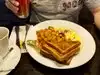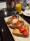 Gorgeous French Toast, absolutely heavenly and my husband enjoyed his eggs Benedict type dish. We also ordered a mimosa and coffee. Sadly the waiter (Steve) could hardly be bothered to interact or speak. He answered my coffee query with regular or decaf though the menu mentioned cappuccino I noted after. My regular coffee mug had a large dirty crack in it, the waiter changed it, no apology. I asked him to take the second one as it was horrible black/brown looking tar. Not very impressive really and the sound was a horrible tinny mix of the indoors live singer and the outside play list speaker. Make your mind up! Shop staff were lovely and attentive, cafe staff need re-training.