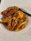 Best fried catfish I’ve had in 40 years! Large portions including fries and a small slaw for about $12. The coleslaw was very creamy like my granny made. I should have ordered extra. Most people ordered wings. They offer several different flavors of sauces and/spices to put on top of your fried meats. This is a takeaway place-one table. They cook everything fresh so be prepared to wait or call in your order. I waited about 20 minutes at lunch time, but there was always 10 people waiting. 100% recommend! Across from McCormick Hampton.