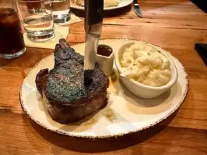 The atmosphere was Cowboy Chic. The drinks and customer service were good. We had the Wagyu tomahawk. We ordered it medium rare, and it was still a little tough and had a lot of gristle. We pretty much think it was not Wagyu. It was not A5, as we did ask before ordering. It had a pretty good flavor though. The mashed potatoes and broccolini were good. I would sit at the bar for drinks and appetizers if I return. There’s valet parking and a parking garage attached to the restaurant. I think valet was $10. We parked in the garage and paid $16 upon exit.