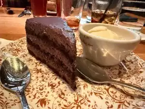 The service terrific, thanks Tanner! The food excellent and the atmosphere wonderful. We had the Elk mini tacos as an appetizer, the Bison for dinner and the chipotle chocolate cake with ice cream for dessert. The tacos were delicious and a great starter. We both had the Bison with mashed potatoes and grilled asparagus. All I can say was the Bison was incredibly delicious and tender. We closed with the chipotle chocolate layer cake, a huge piece with a side of vanilla ice cream. The cake had a mild chipotle kick but was a chocolate lover’s delight. The place has a great atmosphere and the staff friendly. Everything you look for in a great restaurant!