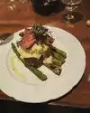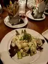 The Ribeye steak was delicious and perfectly cooked. We ordered garlic mash potatoes, mushrooms and asparagus as well that were all delicious. The pork was very dry with no flavor, we let the waiter know and he apologized but we still had to pay for a piece of meat that we only took one bite of, that was very disappointing. The drinks were good, but beware of the up charges included paying extra for a large ice cube in our old fashion. Wait staff was nice. Be sure to make a reservation before going, they get very busy.