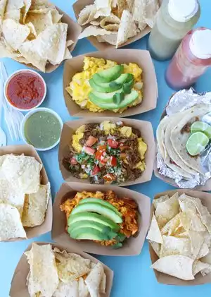 I went here a couple of times on my recent trip to Los Angeles. It's Tex-Mex right in LA. Very cool place with a great menu. Tacos are their specialty but I had the Migos which was basically scrambled eggs with brisket. Delicious. Service was great. Totally recommend.