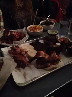 Really enjoyed the food here and the place has a cool vibe. A friend of the owner's recommend it to us. I have to admit the waitress we had was a bit "off" that night and did not provide very warm service - so I was glad she didn't check back excessively. I was there on Halloween night, the place was full but not overflowing. The tables are pretty close together, but folks didn't mind moving around to make room for each other. I over ordered a bit so my out of town guest could enjoy/sample a range of items. Everything was tasty! (Though I must say the sauce was not amazing and good bbq should not need it anyway. Also, the bread was also not what I'm used to in the South, but it was passable.) The band that night was very cool - a bit old timey and hip. The whole experience reminded me of being back in Austin, TX where good bbq and a hip live band are typical parts of life! Art is well selected for the place and the wood tables remind you of being at Stubb's BBQ back in the ATX - hip atmosphere.