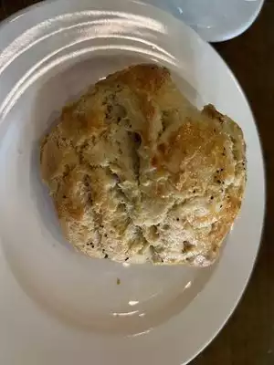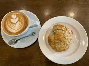 Decaf vanilla latte and blueberry scone. Delicious and beautifully presented. Such a friendly place.