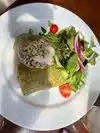 I wish their lemonade ginger had more ginger but it was good! My son was quite pleased with the taste of his omelette that was served with side salad and fries. My shrimp wrap with green papaya was satisfying and filling. It had at least three medium shrimps. Food is fresh. So is the side salad. The dressing was subtle but flavorful. The setting is quite unique, by a creek, with white see through canopy, lights, fountains, verdant with trees and ornamental plants, fragrant with incense and calming music. There were tables that have privacy. Service was friendly.