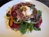 We arrived 15 minutes early and the young hostess with many tables open tells us we need to wait. We were quite surprised. We then ended up at a table that was open when we arrived 15 minutes later. We were not at all happy with the customer service. We then ordered lunch the smoked burrata salad was terrific in its presentation with a glass cover to let out the smoke at your table. We also had the corn bread that was excellent. Then the Argentinian Beef ribeye prepared medium rare. It was quite amazing in flavor and taste cooked in hay. The only thing was that it was a bit fatty. Service was Ok at the table but the bussers with the food were good.