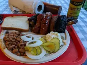 First, you walk in the door and are in the lineup for food. We were late afternoon so we were at our table with our food in minutes. A school group of about 20 was just after us. It could take a while at peak times. Great ambiance. It was raining both inside and out. Heavy outside, drips inside- added to the charm. Potato salad and pinto beans great. Loved the brisket but found the sausage and the ribs to be good but not as much. Very comfortable. Feels like a mix of tourists and locals. We shared the combo plate and it was lots. Pictures and letters from both sides of the aisle.