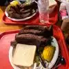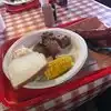 Great Sampler Plate.It had tri tip, sausage, and a huge rib. You also get two sides.I had creamed corn and potato salad. Great Location! There is always a line but good things are worth the wait!