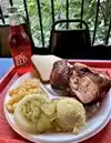 During one of our many bike rides around town, we saw this fairly unassuming. low slung building set next to a ravine 7 a bunch of overhanging trees. Went back later in the evening for a very good & very filling barbecued chicken with sides of potato salad & ma & cheese, including huge slices of onion & pickles. We sat on the enclosed porch that feels almost like it is in the treetops because of the many trees right off the porch. Bric-a-brac adorns the walls, food is served directly on trays, servings are huge, the staff is super-friendly, and there are good, cold sodas & beers to wash down your well seasoned meals & dry rubs to buy so you can try your hand at this at home.