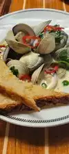 Yellowtail crudo. Yellowtail was actually good but it was buried in a sauce that overwhelmed it. When I could separate the fish I enjoyed it But WHY bury it? Kumamoto oysters were tiny and not like any Kumamoto ever seen Peel and eat shrimp were old — not fresh. And boiled in something that made them taste even worse. Bread is good. Clam chowder hot.