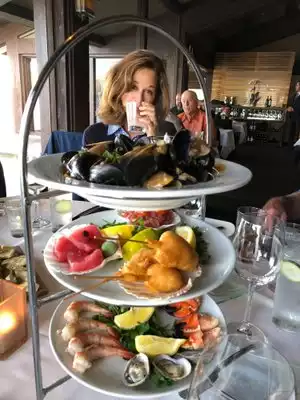 We had a great experience, drinks, appetizers then entrees. One guest had a nice steak while others had the tuna. We also had a selection of seafood appetizers. It was also nice to watch the sailboats race as we enjoyed the evening.
