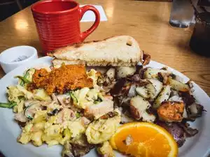 I have enjoyed a big nutritious breakfast here many times here. The Mediterranean Scramble is so good! The atmosphere is homey and I like the wide variety of empty coffee cups on a wall rack one can choose from and then pump your own coffee as many times as you like. It is especially good place for a long conversation as it is not noisy and the tables are not crowded all together. Good for romance or a business meeting or just hanging with friends.
