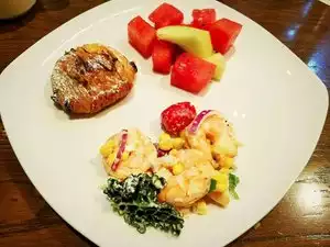Ordered the crispy salmon with crab and tomato salad, and the ruby red trout with apple pecan slaw, wilted spinach, and rice. Phenom!