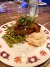We visited as a large party (12 planned, 10 arrived) at the suggestion of one of the group who had previously visited for lunch. The place has several unique things about it. First, all food is sourced local and organic, the beef comes from the owners family ranch. The menu on line doesn't show the steaks but that is what most people had. The drink menu is unique and quirky but the two tried were good. There are a few reviews here complaining about slow and poor service for large parties but the service was quite good on our visit. Drinks and appetizers were fast, try the deviled eggs and the pickles and summer sausage, they were both nice. Collectively we tried the prime rib, filets, pork chop and chicken. The filets come with a wonderful pimento hash base and were prepared exactly as ordered. One couple shared the pork chop and said it was delicious, while another shared the chicken and they liked it. If it's not already summer when you visit ask to sit out back next to the river. Large parties only fit out back so if you're 7 or more plan to be outside. Parking is valet only. My take away, good food in a nice location but pricy. We'll visit again. There is a mercantile stoor attached to the restaurant as well.