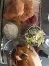 The fry fish of the night was halibut. I was served 3 pieces of halibut, French fries and a delicious coleslaw that had fennel as an ingredient. It was a perfect fish and chip dinner. We shared a dozen happy hour oysters to start. For desert we shared a piece of key lime pie that was perfection. The atmosphere is charming and the servers were efficient and friendly.