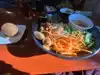 This was our first time and loved it. My spouse had the coconut noodle soup which was enough for both of us. A bit spicey but just enough tang. I had the veggie and tofu rice noodles. Fresh vegetables from snow peas to broccoli and onions. Didn't need any sauce. The tofu was firm and tasty. The patio is a lot quieter than inside and there are long tables for big groups or sharing. The prices are more than reasonable and each serving size is shareable.The only downside is that you stand in line to order and you need to fetch your own water and silverware. Staff is helpful but there really is little service to comment on.