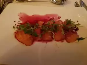 We had a fabulous dinner on March 6, 2017, when the chef from the Portland, Maine restaurant, EVO, cooked at the Beard House. You get to see the house, including the kitchen, where James Beard lived and cooked with his friends. Imagine, James, and Julia, and maybe MFK Fisher, cooking up a storm in the same kitchen! I swear, I could feel his presence and inspiration in the young Chef and cooks in the kitchen. We had appetizers in the greenhouse, a duck confit in a wonderful buttery phyllo dough, and taramasalata with fingerling potatoes. Little radishes spread with mahammara were a tasty nibble (I just wished I could have eaten those with a frosty cold martini, but had to settle for the sparkling white wine.) our group was divided on whether the best appetizer was the lobster-shrimp corn dog or the chicken liver pate with pomegranate. Both were superb. Following an hour of appetizers, we sat down to a 5 course dinner: a very rare, sushi like tuna with avocado and a tasty chilie oil, followed by a sous vide "poached" egg over asparagus, with the most remarkable foam feta topping. That was masterful. The third course, since the Chef is from Maine was lobster and halibut served in a wonderful tomato type sauce. The last "main" was a lamb, seared, but rare, served with labne and arugula. The serving sizes were more then generous, several of us took doggie bags home, just to make sure we had room for dessert. Good call. The dessert was an olive oil cake with blood Or and sorbet. Each course was paired with a different wine. For non members the tab will set you back $175, $135 for James Beard Foundation members, but this was well worth it, as I am quite certain I would have a hard time finding any good restaurant, anywhere ,let alone NYC, where you could have a 5 course menu, with wine pairings, plus the appetizers and white sparkling wine for that price. This dinner topped off a great trip to NYC. I will certainly return to the Beard House again., the food was great, and there was tremendous value considering all the courses and wine pairings. Oh, and when dinner is over the chef comes out to the dining room to answer questions. That in itself was interesting as there seemed to be a number of foodies in attendance.