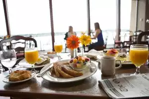 We had a 5 minute wait as it wasn't yet that busy. Very friendly staff who wanted to make sure your dining experience was good. The view of the river, paddle wheeler, marina is lovely and you can also sit outside. We ordered a glass of wine and a beer and gave our dinner order to our server. No sooner had we taken just a few sips of our wine/beer than our dinner arrived! It didn't feel like we'd had a chance to relax and unwind after a busy day. It just felt that we were being hurried along, although the Dining Manager did stop at our table to ask us how we were enjoying our meal. We did say it was alright. Husband ordered the Fish and Chips which showed up as Fish Nuggets. My pasta salad was warm, not hot. We did go for breakfast the next morning and it was very good. Our breakfast server was quite witty and very welcoming to us. And it turns out our dinner server from last night was also on duty for breakfast.