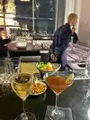 Please note that this review is for the bar that sits above Jean George, the restaurant. The drinks that we had were delicious but exorbitantly priced. The bar serves complimentary seasoned popcorn, almonds and wasabi nuts that were delicious but not refilled. The bartenders were very nice. The view, as others have noted, is wonderful. The atmosphere is very modern and quite striking. The stairs that lead to the lower level restaurant are elegant but dangerous; gleaming black with a side waterfall. The glare that comes off the staircase could really throw someone off.