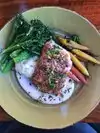 After an afternoon spent touring the Cabrillo National Monument park we stopped at Jimmy's for Happy Hour. Nice setting at the marina with ample outdoor seating. The happy hour menu is a great value. We enjoyed the homemade potato chips with bleu cheese sauce. Yum!! Our server Audrey (who was fantastic) suggested we try their house chipolte ketchup with the chips too. Wow! Dipping the chips in a blend of the two sauces definitely a great suggestion. Next my partner had the waygu sliders with pimento cheese and bacon jam and could not stop raving about them. Being vegetarian, I chose the harvest bowl from the dinner menu. I've had quite a few bowls in my 43 years as a vegetarian and this one did not disappoint. Warm and satisfying with fresh vegetables and baby asparagus. Delicious!