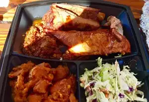 I had the Beef burnt ends dinner. It came with 2 sides: I chose potato salad (very good) and cole slaw(mediocre). The meal was served in a sturdy compartment tray/box.The quantity was very generous. The meat was delicious. Servers are very friendly. The counter space is small, so get ready to be snug! Lots of seating outside (covered). Easiest way to get there, not the shortest. is go North on Decatur Bl. One you have crossed the I95 intersection continue for 2-3 miles on Decatur till you come to a signal at Gowan street (right after the intersection with Cheyenne). Turn left on Gowan, then at a stop sign, turn right on Thom. Restaurant is a couple of blocks up on the right.
