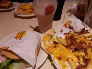 Floors were greasy and slippery. Most of our food was over cooked. Cheese fries had hard crusty cheese and they tasted like used oil with a bad taste. The chicken sandwich was over cooked and dry. Burger was fine. The best thing was the peanut butter milkshake. The cost was $40 with 1 milkshake, 1 burger, 1 chicken sandwich, cheese fry and regular fry. On top of that service was really slow. Servers doubled as cooks, waiters were running both inside and outside of restaurant to wait on tables. Saw only 1 person who worked behind counter full time as a cook. Restaurant completely disorganized and over priced.