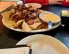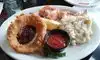 Nothing spectacular but decent food. Lots of fried food. The onion rings were awesome and the steak was cooked well and yummy. I personally couldn't give the place a higher rating based on its over all ambience. It's rather dumpy, falling apart with the remnants of a huge tree inside. The worst thing, in my opinion, is that it was so loud I couldn't even hear everyone in my dinner party... Staff was friendly and prices were reasonable.
