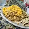 Shared a plate with another person and both of us were full and good atmosphere the owner greeted us on our way out.