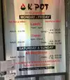 Two families with two small children each (total of eight) had trouble finding a suitable table at KPot. The tables seem to fit parties of 4 or 6 only, so there was a lot of confusion from the staff as to where to seat us. Hot pot or BBQ? Pick your poison. It's hard to enjoy both since its AYCE. We went with the hot pot. There is a lot of variety of items to eat including blue crab and your standard options. We did find ourselves having to ask twice for certain items. There is a sauce bar with every sauce and spice you'll need to make the perfect dipping sauce. I didn't try the Korean BBQ, but it looked very good. There is a fruit and salad bar with a few odd "desserts' as well.