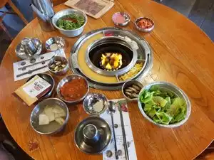 Not sure what to expect and not sure how to rate something we've never had before. There were four of us, two of whom had been here, hence knew what to order. We all shared the Beef Combo - marinated and braised ribs, brisket, and steaks. Also included was Beef Stew Soup,romaine lettuce salad, another salad, some veggies and an assortment of stuff surrounding the center fire pit - scrambled eggs and other sides. In a nutshell, the ribs were the best thing (crispy edges and tender inside) and the other meats weren't far behind. It was hard to enjoy some of the other items, but it was good to try it all. They give you small plates , metal chopsticks, a large spoon and will also give you a fork if requested. Knowing in advance about the long lines, we arrived on a Saturday around 5 pm, lucked out right away with a nearby parking space and only had about a 5-minute wait to be seated. Service was excellent, efficient and quickly moved you through the meal. We did not feel rushed at all, though. One at a time, the meat is placed on a grill on a little fire pit in the center of the table; the server comes back every few minutes to tend to the cooking and dishes it out when it's finished. The room is filled with a light haze from all the cooking and the aromas encourage your appetite. All in all, this was a very nice first experience, and certainly worth a repeat visit.