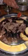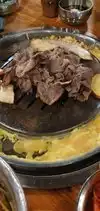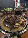We came at an odd time (weekday mid afternoon) and secured parking right in front of the restaurant. That has never happened before. This time we opted for indoor dining to avoid the splattering and smoking from the portable gas grill on the outdoor tables. The indoor grill table with the over head vent were designed to handle all the cooking. We ordered the meat combo. That was more than enough for three. On the table were two salads, soup, sides of japchae, sliced pancake, etc. when the grille was fired up they poured the scrambled eggs into the moat and that fluffed up nice and tasty. The staff cooked all the meats and cut them up as well. Juicy and tender meat. Grills were changed after each meat so that avoided burning. So full but satisfied.