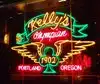 Kelly’s Olympian is one of my favourite downtown bars. It is a very old place that was established back in 1902. Portland’s third oldest continuously operating bar/restaurant. And it has changed hands since it first opened. In the process it has experienced a unique make over from the old days when their were speakeasies and tunnels under the city that lead to the ships on the river. Back when loggers, shipyard workers and sailors came into town to spend their money. And enjoy a few of their vices. One of the owners has a great collection of motorbikes. There are about a dozen vintage motorbikes hanging from the ceiling above. And the bar is filled with great retro items. Signs and neon lights from earlier days. My favourite are the classic red Mobile gas station neon signs of the winged horse– Pegasus. These are right at the bar behind the bar itself against the wall. Making this place easily the most awesome place in town! You can sit at the bar and drink a pint and admire the signs and the vintage motorbikes above. Or you can sit across from the bar at one of the tables and take it all in from a distance. Walk up to the bar to place your orders. I tend to order the Kelly Burger ($8) or the Route 66 Burger ($11) and a pint of dark beer when I stop in mid-day for lunch. Afterwards, I then stroll around back to the area that they have their video poker machines located. And play a few games to see if I can pay for my lunch if I happen to get lucky. It has happened a few times. Hence my frequent lunch visits when I happen to be downtown. Kelly’s Olympian also has live music at night. You can enjoy their music venue in an adjoining room next to the main bar. For most music there is a modest cover charge. Of course like many of the old buildings in Portland that go back to the days of Shanghaiing Portland, you hear tale of haunting and ghosts. If this place has any ghosts at all, then I think I know where they might be. They are sitting up in the ceiling. Sitting on those motorbikes up there. Looking down on the mortals below. Like Daredevil, Ghost Riders In The Sky. Open 10 AM to 2 AM Happy Hour every day from 4 PM to 7 PM and Sunday through Thursdays from 11PM to 1 AM