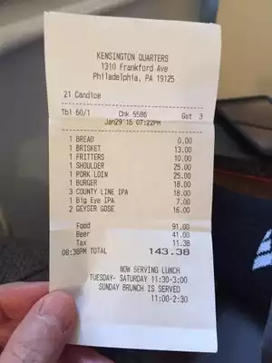 My wife and I eat out regularly at nice places, and in many ways we enjoyed Kensington Quarters, located in Fishtown (in Philadelphia). We were greeted by three attractive young ladies, one of whom took our coats at the door before we were seated. The front of the establishment is a small but lively bar atmosphere. To the right is a staff work station, including a cooler with windows, where you just might see your dinner hanging on a hook. The mid area of the restaurant is a busy open kitchen, with plenty of staff. Towards the rear is the main dining area with separate and semi-separate tables. It feels pretty intimate and cozy, with other patrons very nearby. That is not a big issue with us, we have eaten at several places with a large community table. If you are coming to break up with someone, or order a hit, you might want more privacy. The lighting is nice, and the service was prompt. Several different people came by our table for water, the candle, to check our drinks, etc. Service is good and everyone is pleasant. The menu is interesting, but as people in their mid-50s, we had to ask a lot of questions to figure out what they offered. The food is good, particularly the sauces (which were very good). I had the short rib ($26), and my wife the lamb chop ($28). Here is where the value proposition changes for us. There was nothing like crackers on the table, or rolls or nice hot mini-loaf of bread with dinner. We did not order an appetizer, though several looked very good. A salad would have been extra. They have a 5" cornbread dish with toppings for $20, which sounds good, but expensive. The meals included a decent cut of meat each (8-10 oz), but hardly any vegetable and a small potato (shaped like a little cake). The lamb chops came with something that looked like barley, with a good sauce. It was an unusual carb. The IPA draft beer was $7 per glass, which unfortunately is about the going rate these days - they had other more expensive beers. We often have dessert after dinner, but as funny as this sounds, none of them sounded very good. In keeping with the fancy names, the waiter had to explain each dessert to us, which is just stupid. We ended up not having one. I left the restaurant somewhat hungry, which after an $87 dinner (which includes a good tip), is not good. My wife and I often split dinners and I am satisfied, so don't think I am some big guy with a gigantic appetite. We like this place, but we won't be back due to the small expensive portions and zero extras. Perhaps it is just me, but the whole concept restaurant thing is a bit presumptuous at this point. I am a fairly well traveled 55 year old, and it seems unnecessary (and condescending) to have to have a waiter explain most of the menu items at an American restaurant. If you are a "foody" who loves to pretend they understand all this, I am sure you will fit right in here. There was a group of four men next to us who shared the $100 meat plate, and that dish looked (and smelled) really good. They each had an appetizer or salad before hand, and I would think got filled up pretty well by the end of dinner. It is a big platter of mixed meats. It is a much better value then 8 oz of lamb for $28. If in a group of 3-4, consider that meat platter.