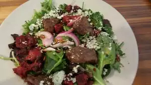 Kerbey Lane Cafe is a true Austin place to dine. They have a variety of things to order on the menu. I chose the Citrus Steak Salad with honey chipotle roasted beets, blue cheese crumbles, roasted sunflower seeds, topped with an orange vinaigrette. The salad was very flavorful. The Akaushi steak should have been sliced much thinner. The steak was about an inch by and inch. Too tough to chew. The service was good.