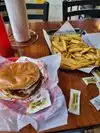 First, the young man helping us at the order counter was fab! Most helpful, fun, great banter...sorry we didn't get his name. The burgers were very good. Plenty of bacon, cheese, etc. French fries perfectly crispy. We were in town visiting and no rushing us out while we visited. Would definitely dine there again.