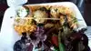 Dinner for two vegans included the yummy hummus and red pepper spreads, cauliflower, roasted brussel sprouts and falafel with cucumber and onion condiments. All tasty and filling. Falafel a little dry but remedied by adding more hummus to the mix. Atmosphere light and airy at late dusk and by night cozy and bright. Service excellent.