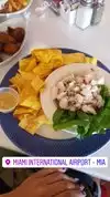At MIA b/f flight and stopped for a bite. Highly recommend the Ku Va Ceviche: swordfish bites cooked in lemon juice w/chopped cilantro and diced red onion. Accompanied with plantain chips. Dipping sauces include aged cayenne pepper hot sauce and garlic-infused virgin olive oil. Our mixologist/server Edwin made it a great experience.
