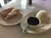 Stopped to eat between flights. First, we were asked about drinks..ordered waters and one coffee. Water came quickly. Waiter came for order and I pointed, on the menu, what we wanted. We got an entirely different sandwich which was very good but cost more. Then I got up to request utensils and napkins. Got up again when it was apparent my coffee wasn’t coming....food was very good, coffee rich and favorable, but service shoddy!