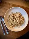 I ordered the tagliatelle with bolognese bianco and it did not disappoint! It has a bit of a kick (heat) to it but by no means overdone. I would definitely order this again. It was the perfect size for a moderately hungry woman. I also got the chocolate chip cookies. Honestly the cookies were nothing special.