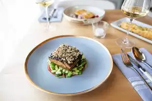 Everything about this place is delightful, except perhaps the trek up the stairs. Every dish we had was superb and creative. You won’t see “old standards” on this menu. Prepare for an adventure of marvelous flavors. The restaurant is co-owned by a winery so their wines are featured.
