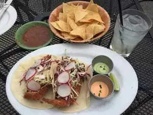 Tacos and a free beer on Tuesdays are a great deal. We sat in the lovely outdoor seating area with trees and lights strung across the courtyard, creating a festive atmosphere. Choices were either the special tacos (foie gras) or the Baja fish tacos with either a Dos Equis amber draft or can of Tecate. We started with the hamachi ceviche, which was tasty--but the lime aioli was heavy on the mayo. Usually ceviche is only lime juice, so the mayo obscured the taste of the fish a bit. The Baja tacos were fresh with a nice crunchy plantain crust, but also pretty bland--the only flavor came from the 2 side sauces. My husband said his foie gras tacos were pretty average. Overall it was a great deal and really nice outdoor seating, but the food wasn't really memorable. I'd say it's three and a half stars--we wouldn't make a special trip to return here, but it's a good place if you're in the neighborhood.
