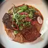 Tasty defines this dining experience. The food is so delicious,I marvel at every bite. The wait staff are welcoming, helpful, and kind. It feels good to be in such an interesting space-one wall features deep red upostered rounded banquettes and above is a beautiful hand painted mural.In the dining room, tables and chairs are arranged to accommodate friends and families of various ages with an aditional outdoor space. Conversation is lively,and the food, service and decor are exceptional.