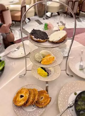 Came for a late Sunday lunch—the restaurant is beautiful inside, loved their decor! Our server Julio is awesome—friendly and attentive. Food was great! Enjoyed the Escargots, Cobb Salad and Caesar Salad for starters. Also got the Caviar Bagel Tower—can’t go wrong with caviar, so delicious! The Chicken BLT and Grilled Salmon were good—didn’t realize the additional avocado request for our BLT was $12. For dessert, hubby was given a small piece of chocolate cake with a candle, to celebrate his birthday! We noticed it was closing time but were never felt rushed, really appreciated that.