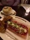 Le Grand Boucherie is a beautiful spot that has its charm but ultimately fell a bit short in a few areas during my visit. The ambiance is sophisticated, with the classic French brasserie decor and a warm, inviting atmosphere. Itâs the kind of place you want to linger over a glass of wine. However, while the setting was great, some elements didnât quite meet the mark. The service was friendly and attentive; my server was knowledgeable about the menu and provided helpful suggestions. The cocktails were also a highlight, thoughtfully crafted and flavorful, which made for a nice start to the meal. The food was solid but didnât deliver the wow factor I expected. Some dishes were well-executed, like the mussels in red sauce (though I've heard they've changed this) and Onion soup but others fell flat, like the steak. For example, we ordered our steak at a medium temperature and came out well done, was slightly under-seasoned, and the sides lacked the depth of flavor that can make or break French cuisine. It's a lovely place to grab a drink or light bites but for the price, I expected a bit more finesse and consistency in the food. Iâd give it another try but would probably set my expectations accordingly.