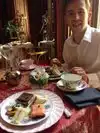 In all our travels, we include an afternoon tea experience; it makes a nice break from walking and sightseeing. Certain standards are always welcome: A beautiful venue? Check. Lovely presentation with informed and friendly service? Check. Delicious food? Check. This place included some surprises that only enhanced our time there. The starter course of either soup or fresh fruit salad (which we had) is great! Also new to us was the offer to pair a different tea with each course. How fun is that?? This meant the server had to pour the tea when needed which was always hot and fresh, rather than a pot on the table getting cold. The elegant layered crepe cake they serve for dessert is a tasty, exotic treat. Our server was knowledgeable, friendly, professional and prompt. We took public transportation and walked there without difficulty. This is not the snooty version of tea but recalls an gentle time of ladies and gentlemen.