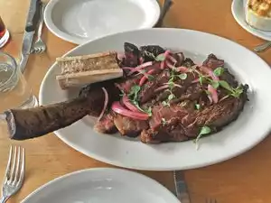 We had a similarly positive experience to others at this bustling, fashionable steakhouse attached to butcher's shop. Staff were impressively knowledgeable about the various cuts on offer and our choices were cooked to perfection. Only criticism was an overly long wait of 45 mins for entrees: a pricey bottle of Oregon wine specifically chosen to complement the main had been glugged before tardy steaks showed up.