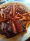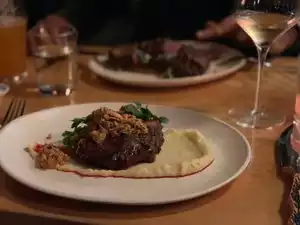 This restaurant is for carnivores, vegans keep moving. Had a most delicious dinner of their flank steak prepared with chanterelles and golden beets. The portion was just right. Sometimes restaurants overwhelm the plate with massive amounts of meat, but not here. You were left sated and not overly full. At our table we had the deli eggs, onion rings and fries. The fries came with a creme freche sauce that had a touch of horseradish (I think.) All of us enjoyed our plates thoroughly and only clean dishes were returned to the kitchen.