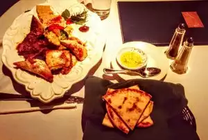 Shared late dinner with a triple dip starter, lemon soup, and lamb shank special. All very good but dessert was fantastic. First one on menu and worth wait. Would have liked to see lamb used in moussaka..they use beef. Also question use of "organic salmon" description for farmed Scottish fish.