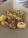 LeZie is a beautiful space in a great neighborhood. It was within walking distance of my hotel and seemed to have decent reviews. Having visited Venice, I was hoping to relive that culinary experience. When we arrived, the place was packed, which is also a good sign. But unfortunately, Le Zie is just simply underwhelming. It is also EXTREMELY NOISY. We looked forward to our appetizer of "Fried Calamari and Zucchini, Spicy Tomato Sauce" ($13). The calamari was underfried (or fried in oil that wasn't hot enough) and rubbery. The tomato sauce was over-the-top spicy, even for those of us used to it. The best part was the slightly crispy zucchini. But the entire dish was swimming in grease (see photo) I chose the quintessential dish of "Venetian Style Calf’s Liver, Sautéed Onion, Polenta" ($22). The veal was underdone and swimming in an underflavored onion sauce of sorts rather than a delicious mound of caramelized onions. The polenta, as well as another 'mystery' puree that was on the plate, was simply bland and unappealing to the eye. The entire entree was basically the same texture. This dish was just aching for something that wasn't the consistency of baby food, something crispy and green...and some flavor. (see photo) My dining partner chose the "Rigatoni, Rosemary Veal Ragout" ($18). This entree was much tastier, with added herbs and cheese. But the veal was at a minimum within the sauce. Not bad, but not great either. Just sort of meh. The decibel level of the noise in the dining room was absurd. It got louder and louder over the course of the dinner, making conversation across the table inconvenient and uncomfortable. The tiny table was just enough to fit the necessities. We were squeezed in like sardines. This is certainly no place for romance. This is not a restaurant that I would return to on my next visit to NYC.