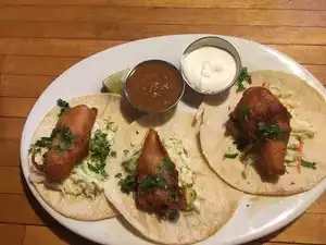 Skip the Decoy next door. We had the smoked pork soft tacos and fish soft tacos. Three generously filled flour tacos came with a side of really fresh house salsa. The fish was battered and fried. The smoked pork was from carlton farms.